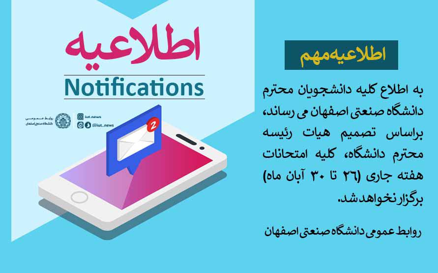 بنا بر اعلام روابط عمومي دانشگاه صنعتي اصفهان، بر اساس تصمیم هیات رئیسه دانشگاه، کلیه امتحانات دانشجويان از تاريخ 26 تا 30 آبان ماه برگزار نخواهد شد.