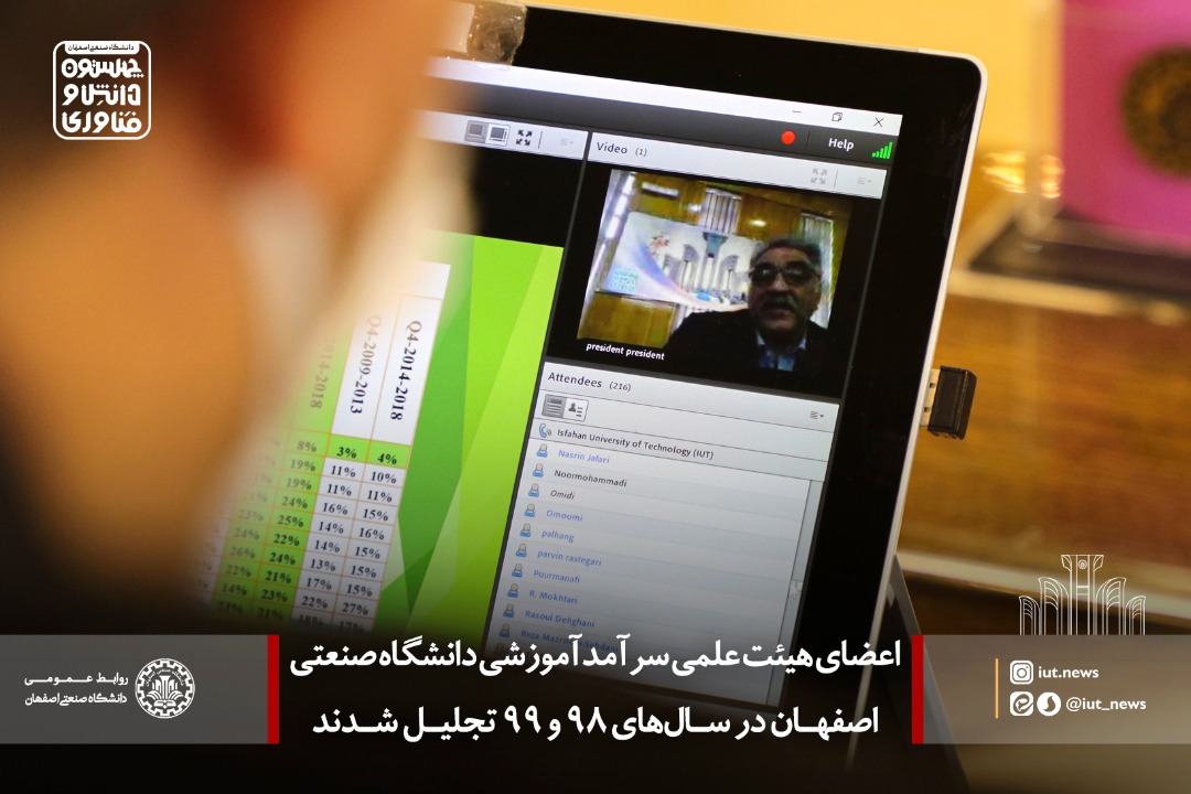در نشست مجازی هیئت رئيسه دانشگاه صنعتي اصفهان با اعضاي هیئت علمي این دانشگاه از30 عضو هیئت علمی سرآمد در حوزه آموزشی دانشگاه صنعتی اصفهان در سال های 1398 و 1399 تجلیل شد.