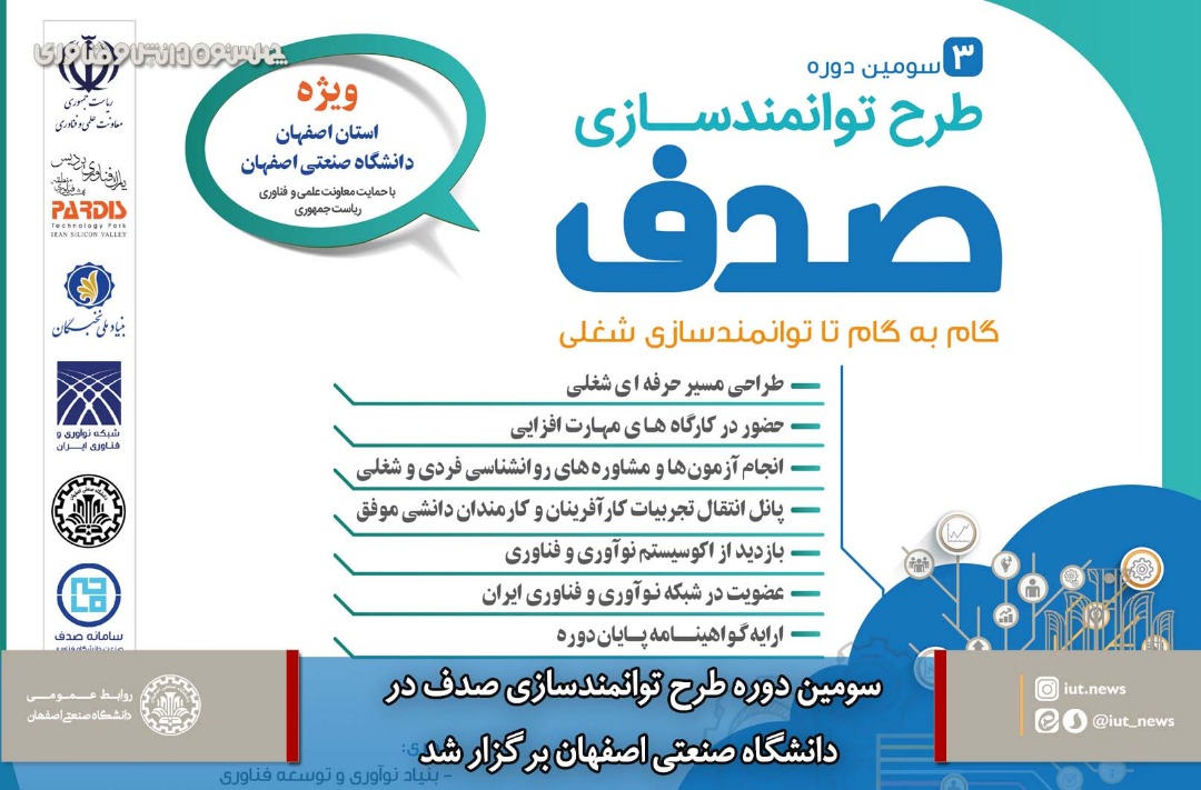 با اجراي سومين دوره طرح توانمندسازي صدف در دانشگاه صنعتي اصفهان، بيش از 100 نفر از دانشجويان و فارغ التحصيلان نخبه این دانشگاه براي انتخاب مسير شغلي آينده و نقش آفريني در ساختار نوآوري و فن آفريني كشور هدايت و راهنمايي شدند.