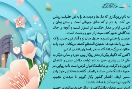 فرصت را مغتنم شمرده، حلول سال نو و آغاز قرن جدید را که مقارن با ماه عیدها، شعبان المعظم گشته تبریکات خود را به خانواده بزرگ دانشگاه صنعتی اصفهان تقدیم نمایم.