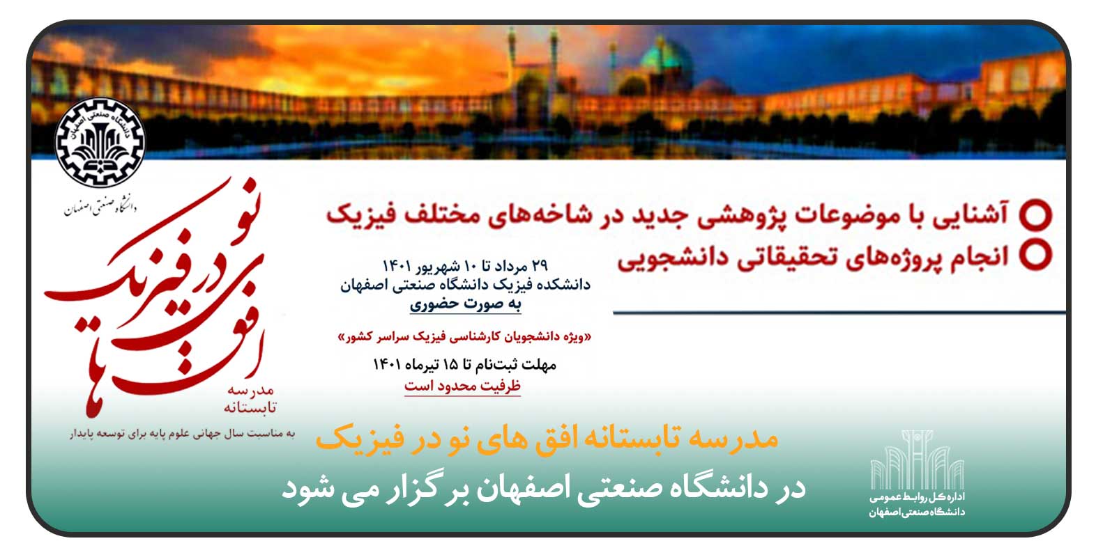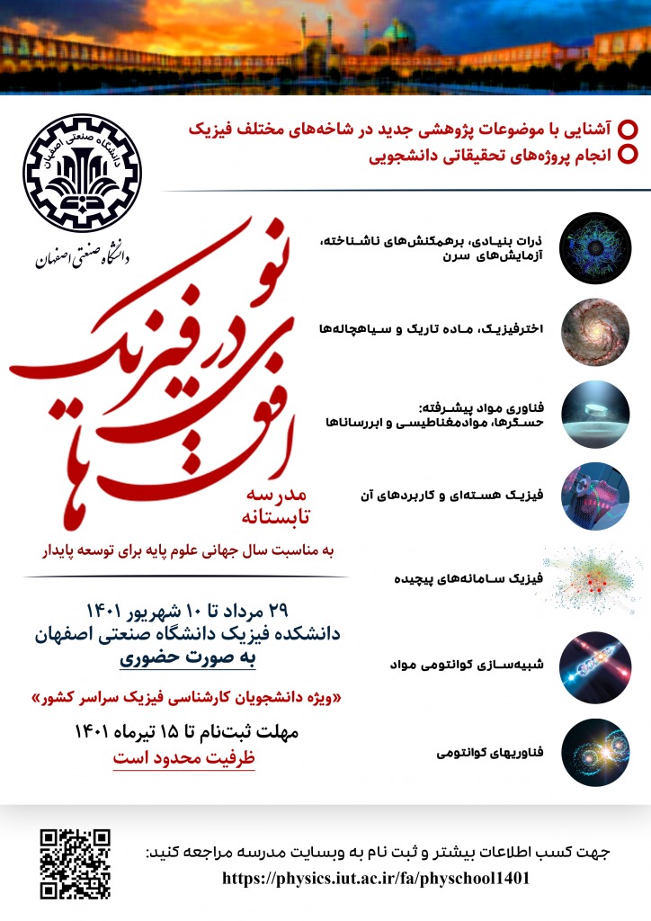 دانشکده فیزیک دانشگاه صنعتی اصفهان به مناسبت سال جهانی علوم پایه و به منظور تقویت و گسترش رشته فیزیک، رویداد 'مدرسه تابستانه افق های نو در فیزیک' را از تاريخ 29 مرداد تا 10 شهريور ماه به صورت حضوري برگزار می کند.