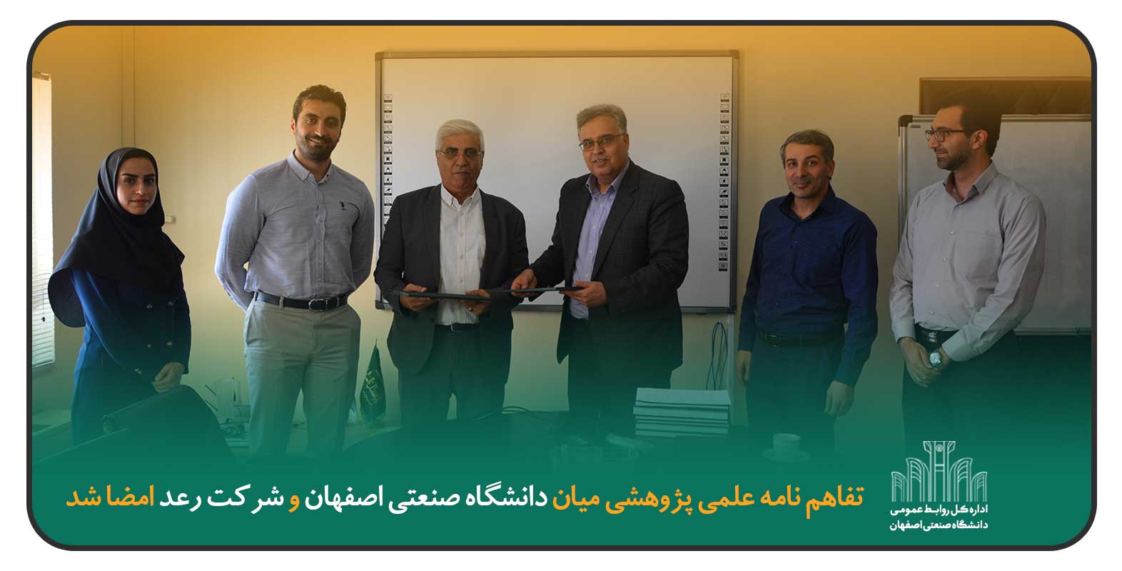 تفاهم نامه همكاري دانشگاه صنعتي اصفهان و شركت رعد از شركت هاي فعال در حوزه تولیـد تجهیـزات برق صنعتـی، با هدف توسعه ارتباطات علمي – پژوهشي ميان دانشگاه و بخش خصوصي با حضورمعاون پژوهش و فناوري دانشگاه و مديرعامل شركت رعد منعقد شد.