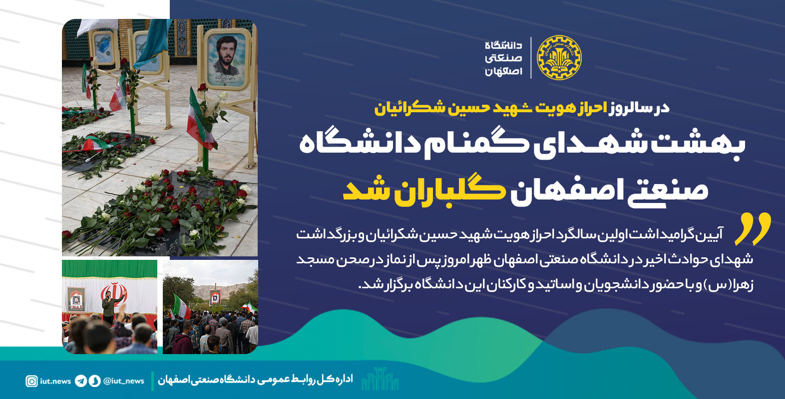 آيين گراميداشت اولين سالگرد احراز هويت شهيد حسين شكرائيان و بزرگداشت شهداي حوادث اخير در دانشگاه صنعتي اصفهان ظهر امروز پس از نماز در صحن مسجد فاطمه زهرا (س) و با حضورپرشور و استقبال دانشجويان و اساتيد و كاركنان اين دانشگاه برگزار شد.