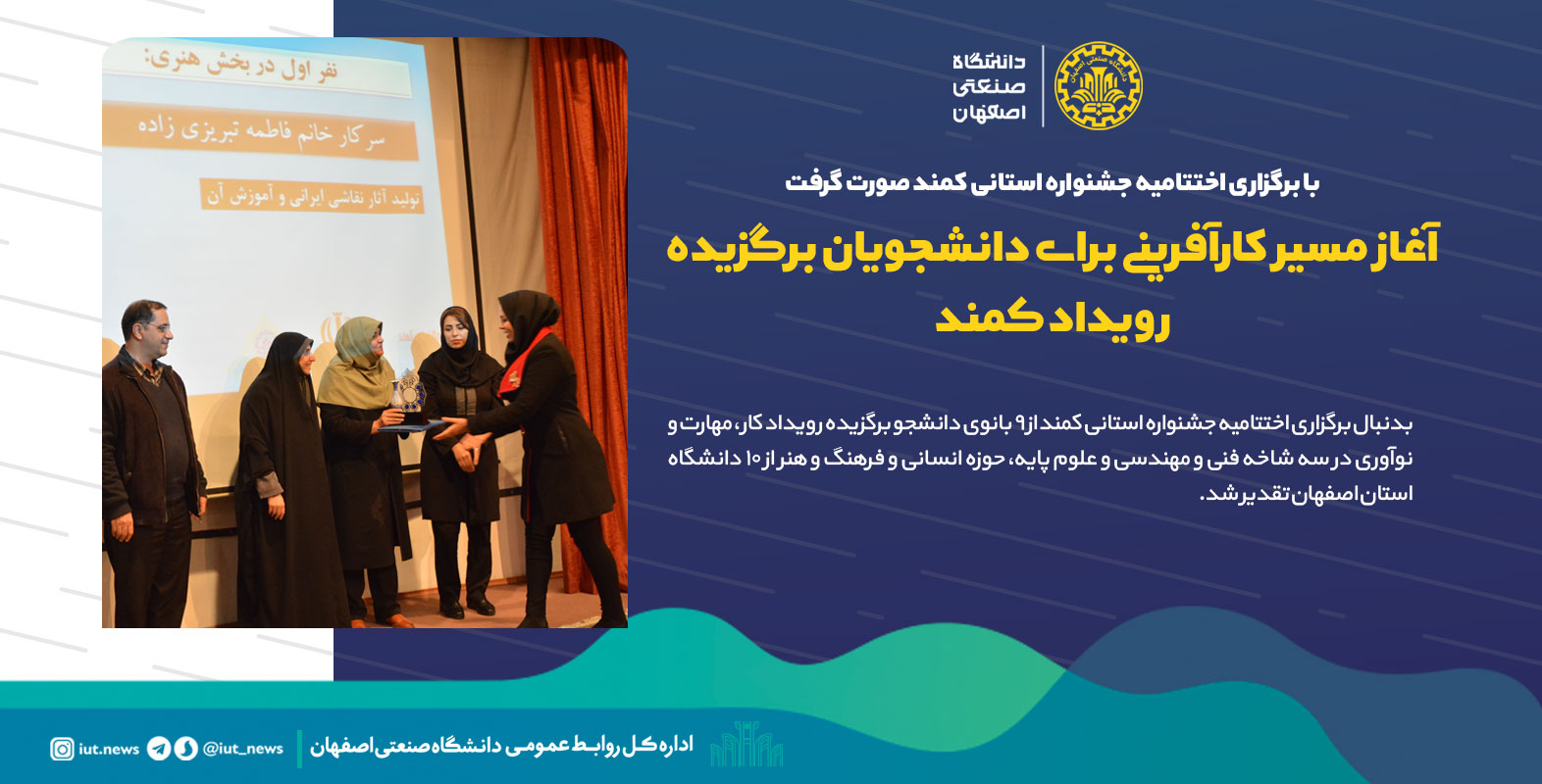 بدنبال برگزاری اختتامیه جشنواره استانی کمند از 9 بانوی دانشجو برگزیده رویداد کار، مهارت و نوآوری در سه شاخه فنی و مهندسی و علوم پایه، حوزه انسانی و فرهنگ و هنر از 10 دانشگاه استان اصفهان تقدیر شد.