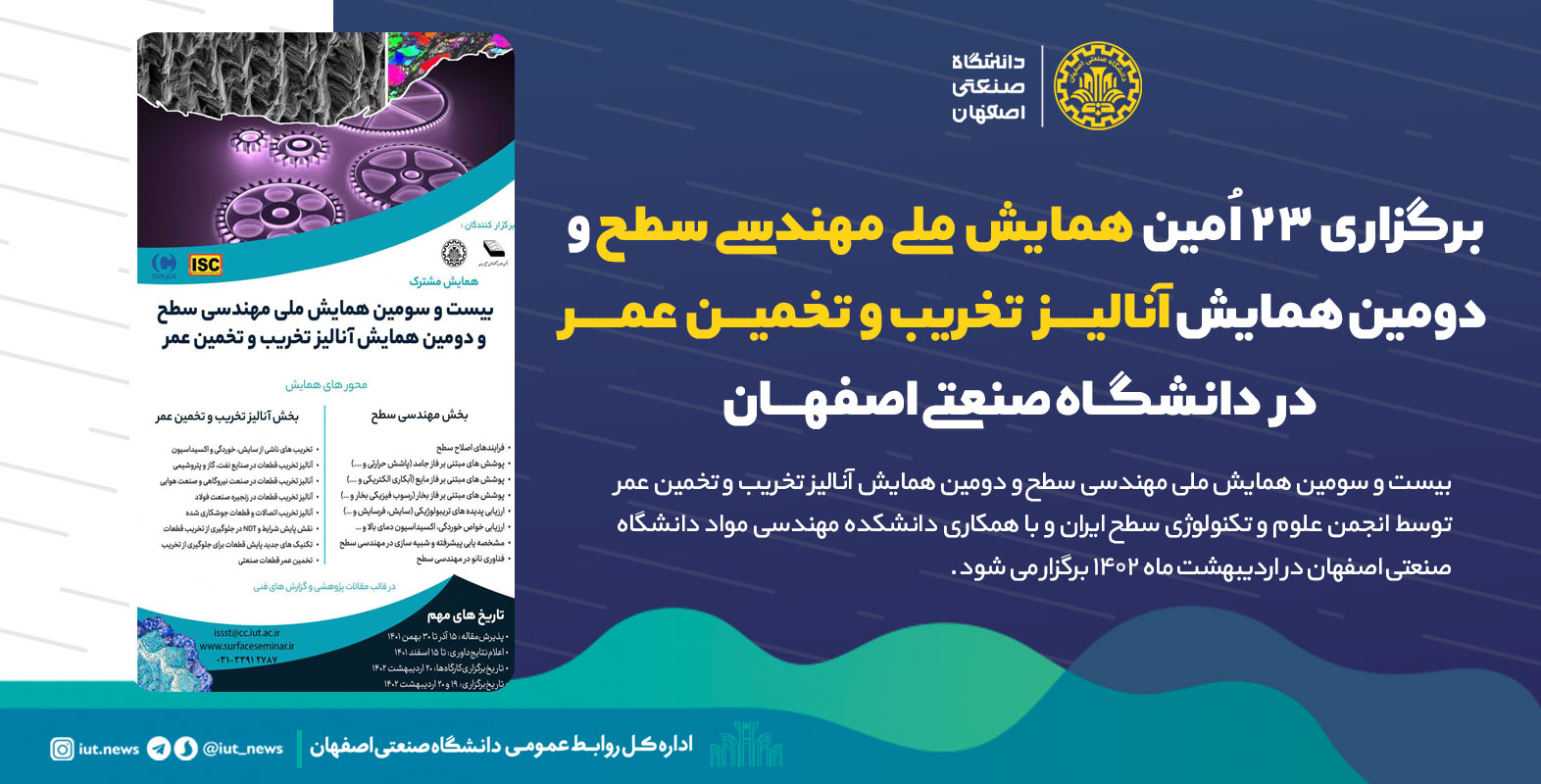 بیست و سومین همایش ملی مهندسی سطح و دومین همایش آنالیز تخریب و تخمین عمر توسط انجمن علوم و تکنولوژی سطح ایران و با همکاری دانشکده مهندسی مواد دانشگاه صنعتی اصفهان اردیبهشت 1402 برگزار می شود .