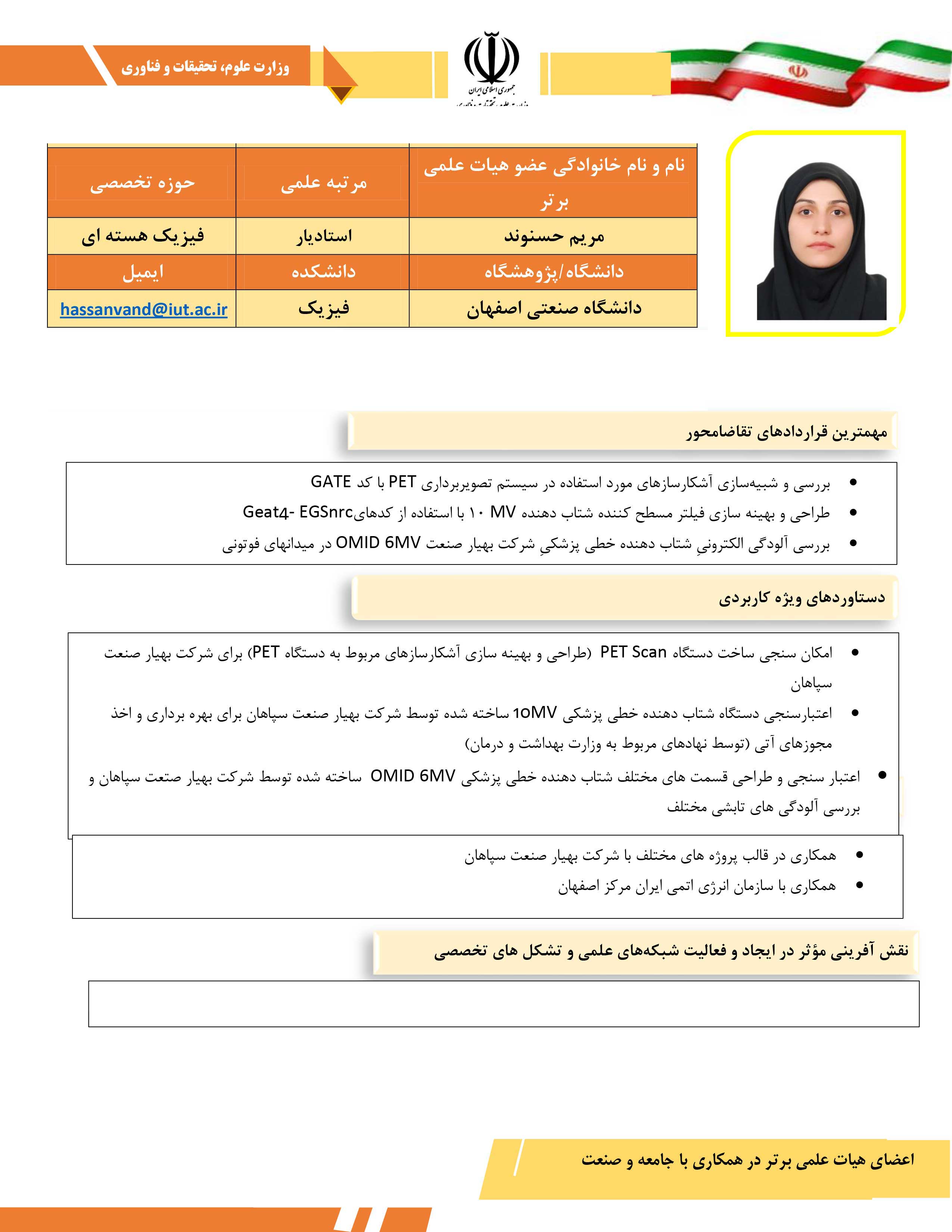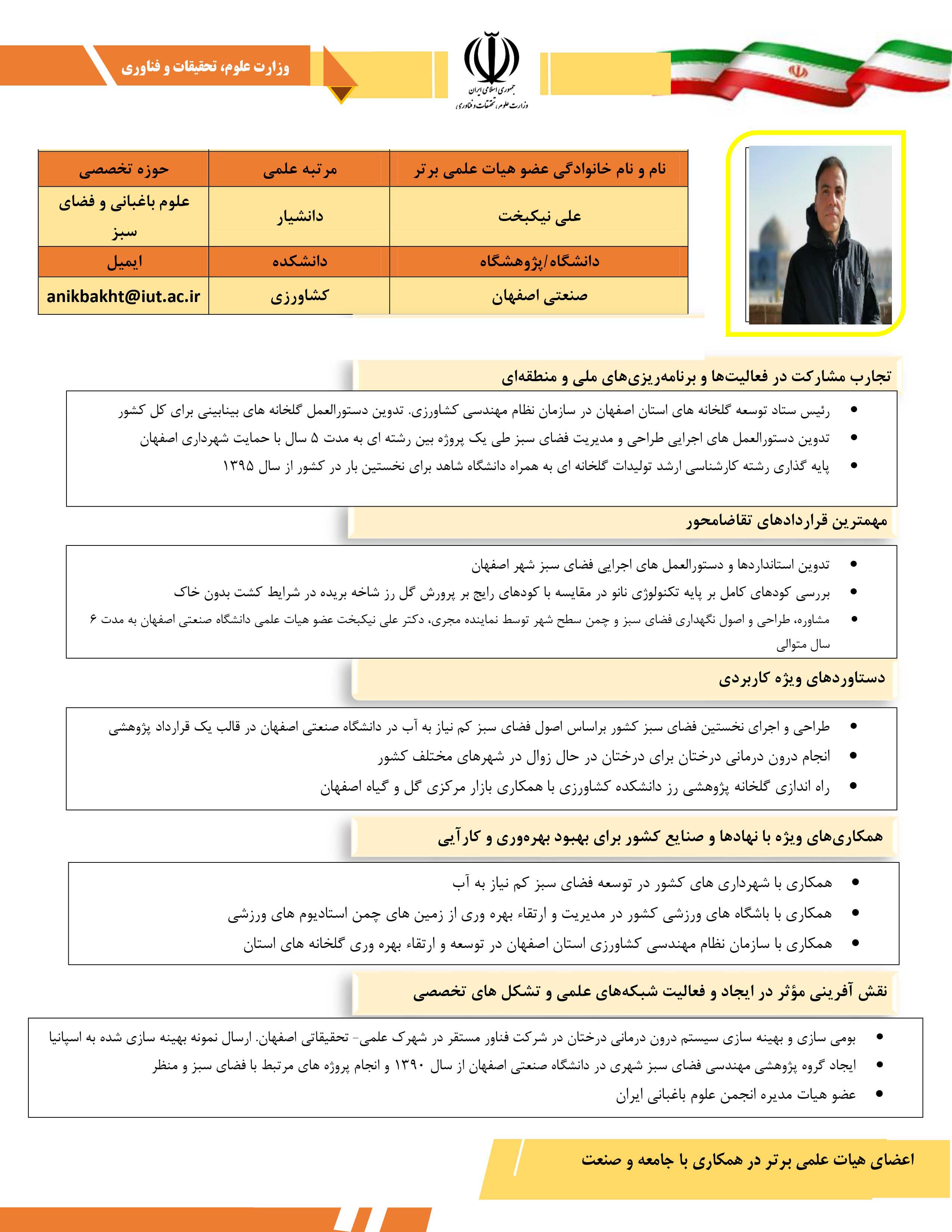 گفتني است: مشارکت در فعالیتها و برنامهریزیهای ملی و منطقهای، اجرای قراردادهای پژوهشی تقاضامحور، ارائه دستاوردهای مهم در رفع مشکلات کشور، همکاری با نهادها و صنایع کشور برای بهبود بهرهوری وکارایی و نقشآفرینی مؤثر در ایجاد و فعالیت شبکههای علمی و تشکلهای تخصصی اثرگذار در امور اجتماعی و اقتصادی، از جمله شاخصهای شناسایی اعضای هیئت علمی برتر در همکاری با جامعه و صنعت عنوان شده است. در ادامه صفحات مرتبط با اعضای هیئت علمی دانشگاه صنعتی اصفهان را مشاهده می کنید.