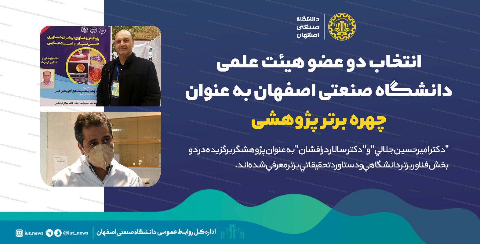 'دكتر اميرحسين جلالي ' و' دكتر سالار درافشان' به عنوان پژوهشگر برگزيده در دو بخش فناور برتر دانشگاهي و دستاورد تحقيقاتي برتر معرفي شده اند.