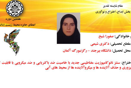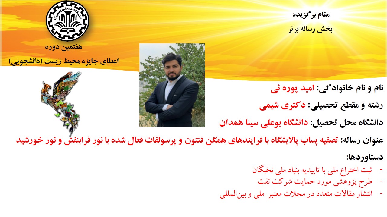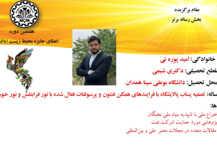 از جمله طرح های برگزیده معرفی شده در این دوره می توان به طرح برگزیده امید پوره ئی، دانشجوی دکترای شیمی، دانشگاه بوعلی سینا همدان اشاره کرد که موفق به کسب عنوان مقام برگزیده در بخش رساله برتر شد. این طرح با عنوان تصفیه پساب پالایشگاه با فرایندهای همگن فنتون و پرسولفات فعال شده با نور فرابنفش و نور خورشید، موفق به کسب افتخاراتی همچون ثبت اختراع ملی با تاییدیه بنیاد ملی نخبگان، طرح پژوهشی مورد حمایت شرکت نفت و انتشار مقالات متعدد در مجلات معتبر ملی و بینالمللی، شده است.