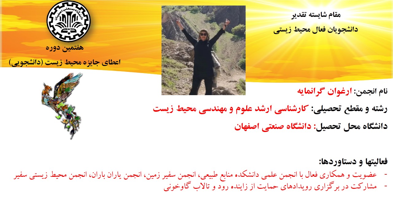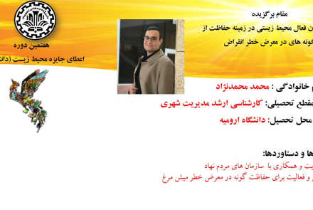 همچنن از تلاش محمد محمدنژاد، دانشجوی کارشناسی ارشد مدیریت شهری از دانشگاه ارومیه برای حفاظت از گونه های در معرض خطر انقراض مانند میشمرغ، پرندهای که در فهرست سرخ اتحادیه بینالمللی حفاظت از طبیعت قرار دارد ، در بخش دانشجویان فعال محیط زیستی در زمینه حفاظت از گونه های در معرض خطر انقراض ، تقدیر به عمل آمد.