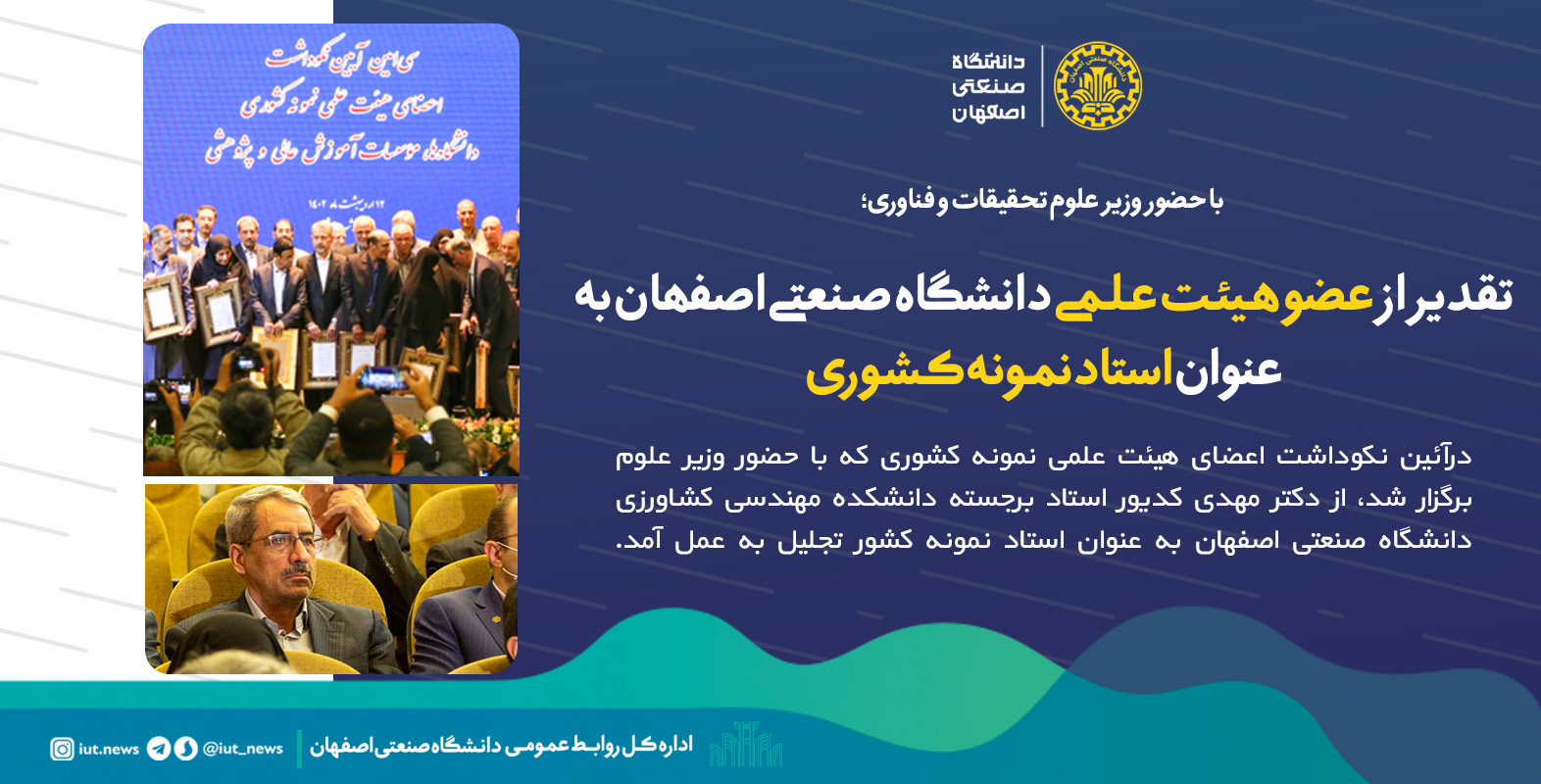 درآئين نکوداشت اعضای هیئت علمی نمونه کشوری که با حضور وزیر علوم در دانشگاه شهید بهشتی برگزار شد، از دکتر مهدی کدیور استاد برجسته دانشکده مهندسی کشاورزی دانشگاه صنعتی اصفهان به عنوان استاد نمونه کشور تجلیل به عمل آمد.