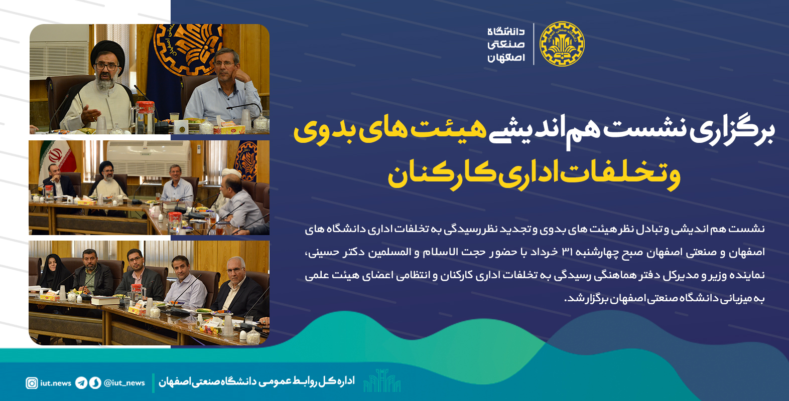 نشست هماندیشی و تبادل نظر هیئتهای بدوی و تجدیدنظر رسیدگی به تخلفات اداری دانشگاههای اصفهان و صنعتی اصفهان با حضور حجتالاسلاموالمسلمین دکتر حسینی، نماینده وزیر و مدیرکل دفتر هماهنگی رسیدگی به تخلفات اداری کارکنان و انتظامی اعضای هیئتعلمی به میزانی دانشگاه صنعتی اصفهان برگزار شد.