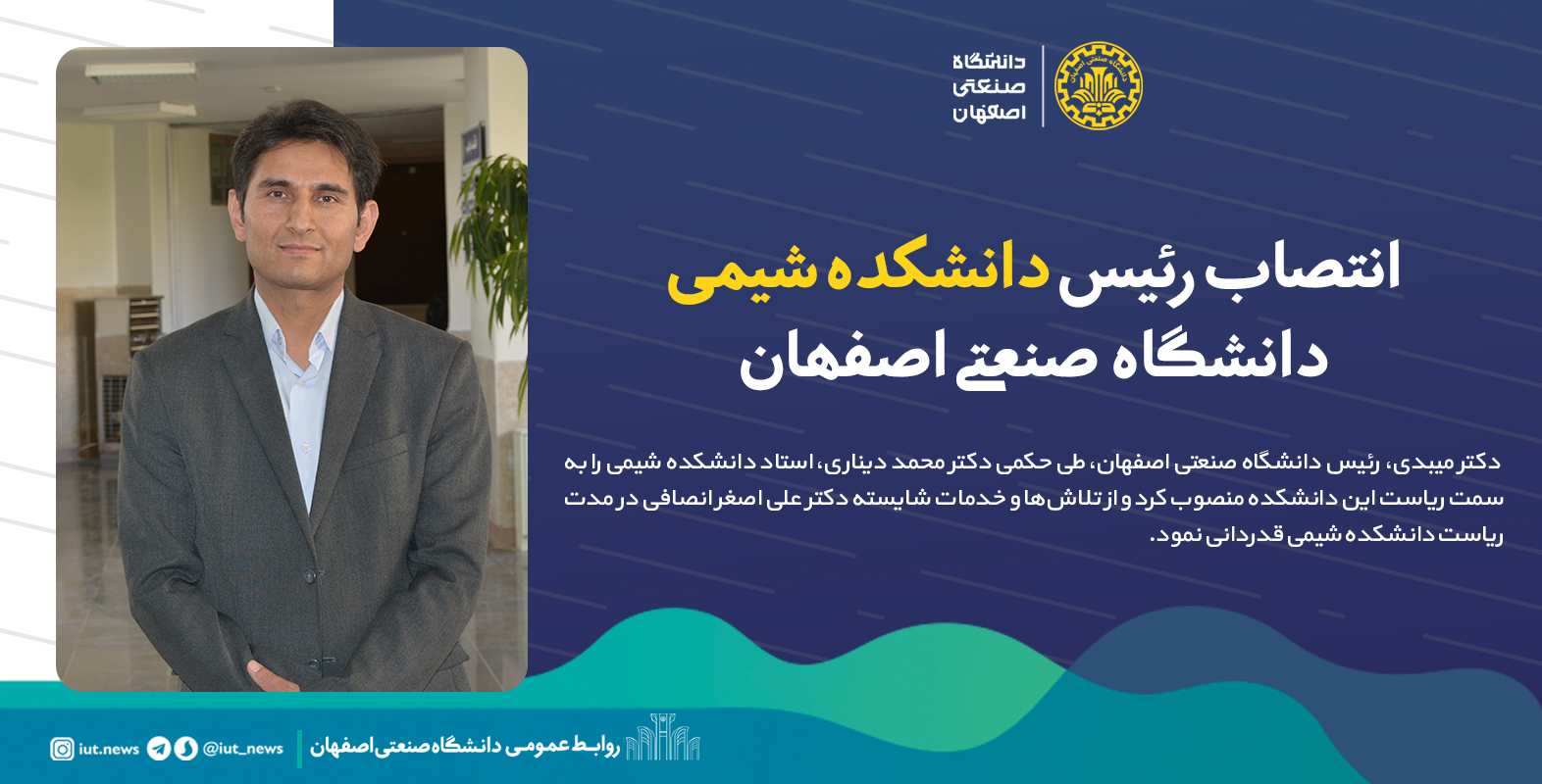 دکترمیبدی، رئیس دانشگاه صنعتی اصفهان، طی حکمی دکتر محمد دیناری، استاد دانشکده شیمی را به سمت ریاست این دانشکده منصوب کرد و از تلاشها و خدمات شایسته دکتر علی اصغر انصافی در مدت ریاست دانشکده شیمی قدردانی نمود.