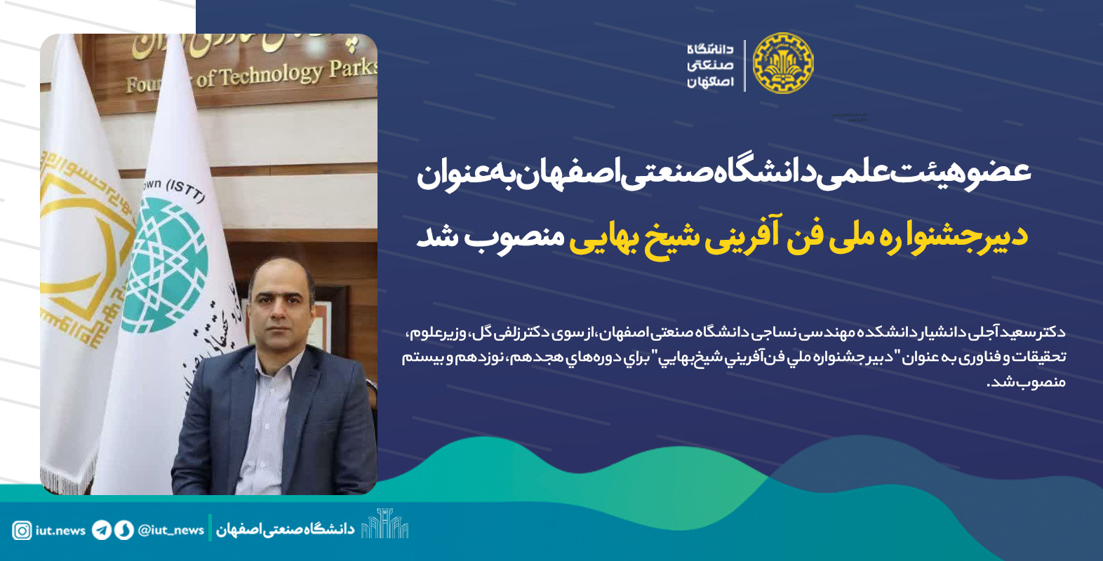 دکتر سعید آجلی دانشیار دانشکده مهندسی نساجی دانشگاه صنعتی اصفهان،از سوی دکتر زلفی گل، وزیرعلوم، تحقیقات و فناوری به عنوان 'دبير جشنواره ملي فنآفريني شيخبهايي' براي دورههاي هجدهم، نوزدهم و بيستم منصوب شد.