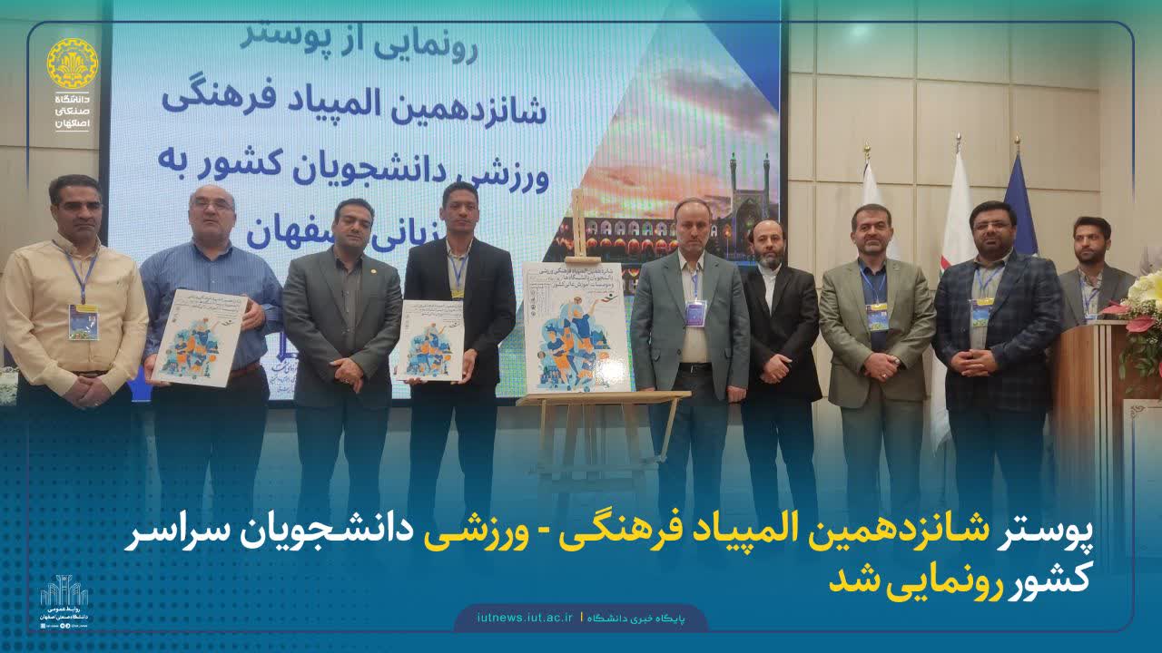 به گزارش روابط عمومی دانشگاه صنعتی اصفهان؛ همزمان با گردهمایی مدیران تربیت بدنی دانشگاههای کشور مراسم رونمایی از پوستر شانزدهمین المپیاد فرهنگی - ورزشی دانشجویان دختر و پسر دانشگاهها و موسسات آموزش عالی کشور با حضور دکتر هاشم داداش پور معاون وزیر علوم، تحقیقات و فناوری و رئیس سازمان امور دانشجویان، دکتر ابراهیم نعیمی سرپرست معاونت امور دانشجویان داخل سازمان،دکتر سردار اصلانی معاون دانشجویی دانشگاه اصفهان، دکتر مجتبی بابایی خورزوقی معاون دانشجویی دانشگاه صنعتی اصفهان، دکتر ابراهیم علی دوست مدیر کل تربیت بدنی سازمان امور دانشجویان و مدیران تربیت بدنی دانشگاههای میزبان برگزار شد.