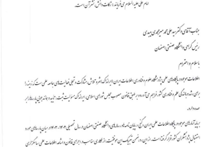 دکتر محمدحسن زاده، با ارسال تقدیرنامه به رئیس دانشگاه صنعتی اصفهان خاطرنشان ساخت: اطلاعات موجود در پایگاههای علمی پژوهشگاه علوم و فناوری اطلاعات ایران ثمره تلاش، مشارکت و تجلی فعالیتهای جامعه علمی است که زمینه را برای رشد و بالندگی علم و فناوری کشور، فراهم میآورد.