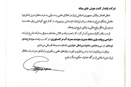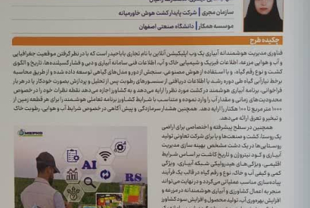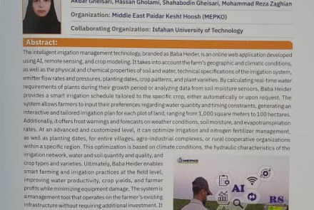 این شرکت با مدیریت دکتر مهدی قیصری، عضو هیئتعلمی دانشگاه صنعتی اصفهان، موفق شد با مشارکت ۲۵ درصدی، رتبه سوم بخش طرحهای توسعهای را در این جشنواره کسب کند. دکتر پروانه عسگری نیا، پژوهشگر و مدیرعامل این شرکت، لوح تندیس و جایزه جشنواره بینالمللی خوارزمی را از دستان دکتر مسعود پزشکیان، رئیسجمهور، دریافت کرد.گفتنی است «این سامانه با هدف بهینهسازی مصرف آب در بخش کشاورزی و استفاده از فناوریهای نوین طراحی شده است و میتواند نقش مؤثری در مدیریت پایدار منابع آبی کشور ایفا کند.» جشنواره بینالمللی خوارزمی به عنوان یکی از معتبرترین رویدادهای علمی کشور، هر ساله با هدف شناسایی و تقدیر از پژوهشگران، مخترعان و فناوران برتر در حوزههای مختلف علمی برگزار میشود.