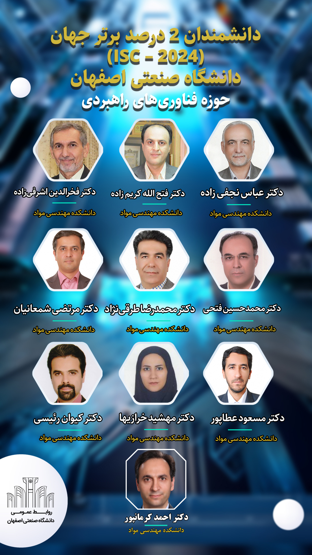 درحوزه فناوری های راهبردی (هوش مصنوعی، نانو و ...)، دکتر عباس نجفی زاده، دکتر فتح اله کریم زاده، دکتر فخرالدین اشرفی زاده، دکتر محمدحسین فتحی، دکتر محمدرضا طرقی نژاد، دکتر مرتضی شمعانیان، دکتر مسعود عطاپور، دکتر مهشید خرازی ها، دکتر کیوان رئیسیو دكتر احمد كرمانپور از اعضای هیأت علمی دانشکده مهندسی مواد دانشگاه صنعتی اصفهان، پژوهشگران 2 درصد برتر این حوزه را به خود اختصاص داده اند.