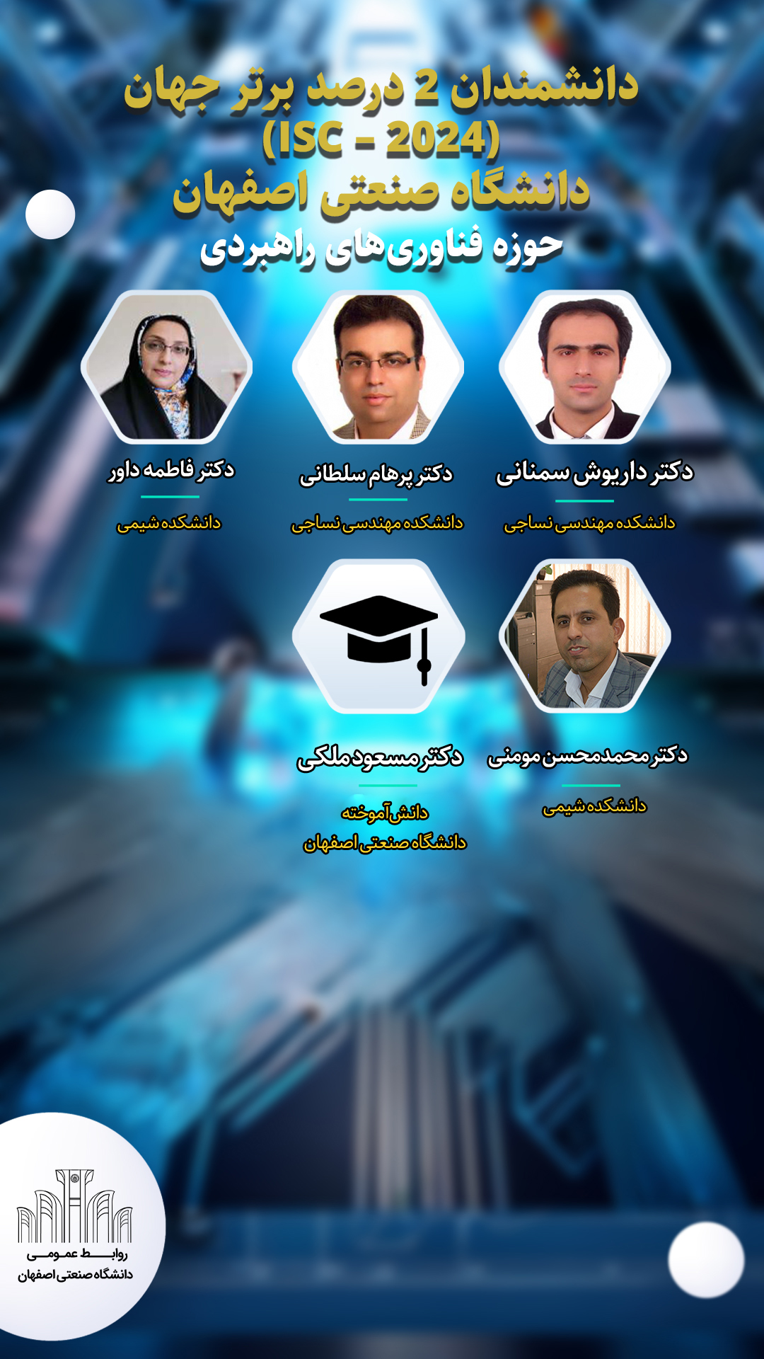 همچنین، دکتر داریوش سمنانی و دکتر پرهام سلطانی از اعضای هیأت علمی دانشکده مهندسی نساجی، دکتر فاطمه داور و دکتر محمد محسن مومنی از اعضای هیأت علمی دانشکده شیمی، دکتر مسعود ملکی دانش آموخته دانشکده مهندسی مکانیک، پژوهشگران 2 درصد برتر دانشگاه صنعتی اصفهان درحوزه فناوری های راهبردی هستند.