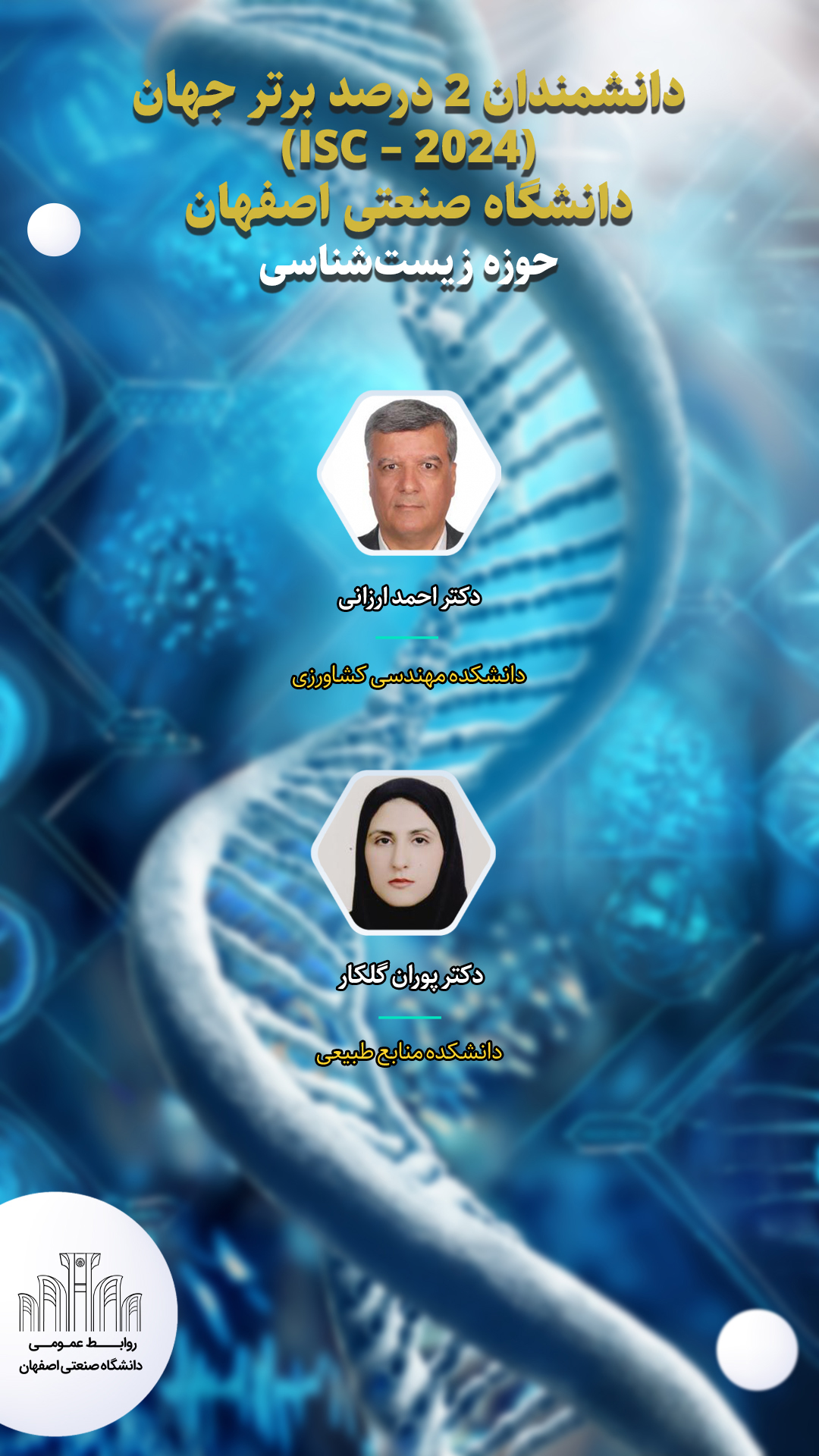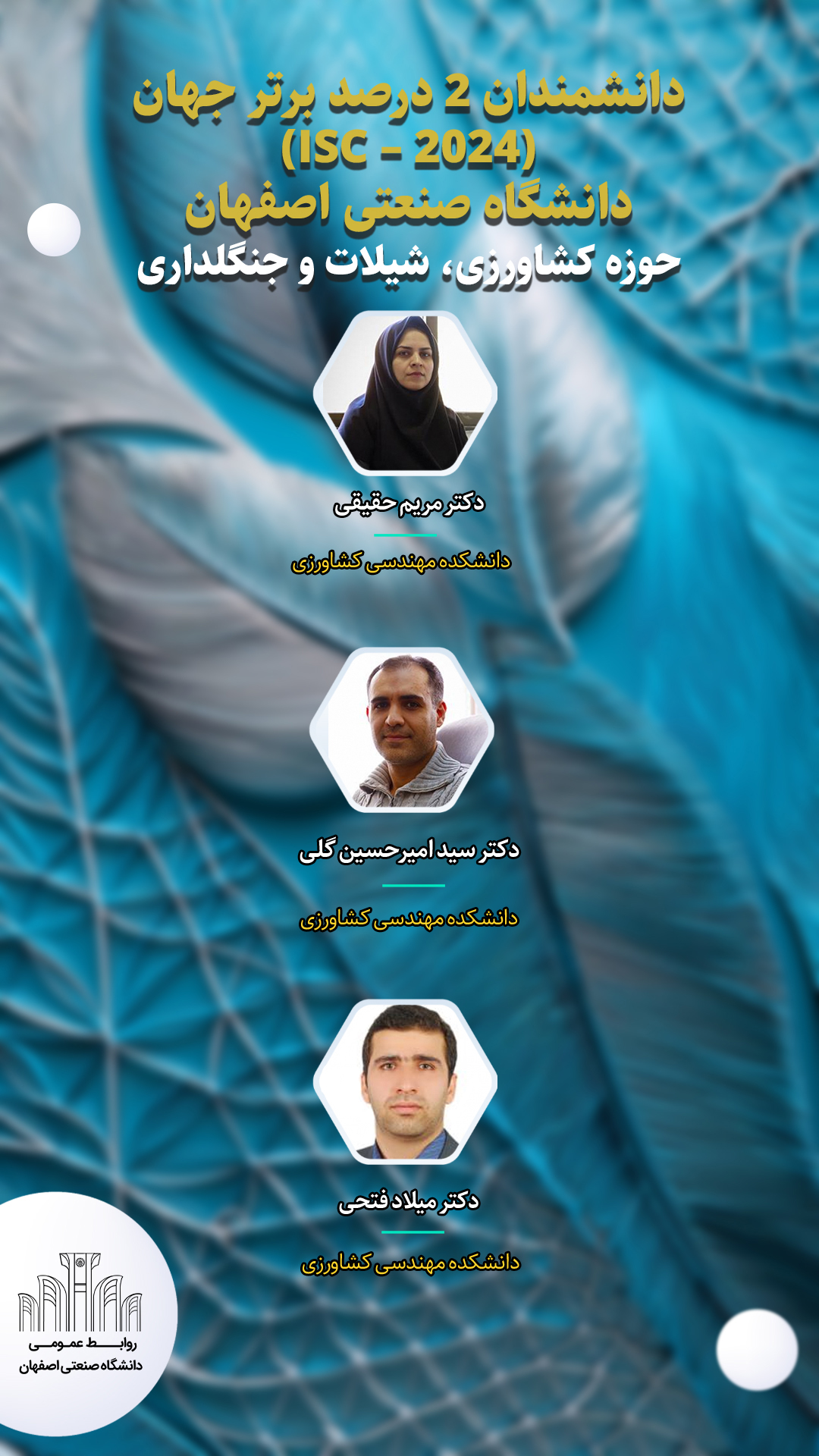 در حوزه کشاورزی، شیلات و جنگلداری دکتر سید امیرحسین گلی، دکتر مریم حقیقی و دکتر میلاد فتحی از اعضای هیأت علمی دانشکده مهندسی کشاورزی، در حوزه موضوعی زیست شناسی دکتر احمد ارزانی عضو هیأت علمی دانشکده مهندسی کشاورزی و دکتر پوران گلکار عضو هیأت علمی دانشکده منابع طبیعی، دیگر پژوهشگران 2 درصد برتر این دو حوزه معرفی شده اند