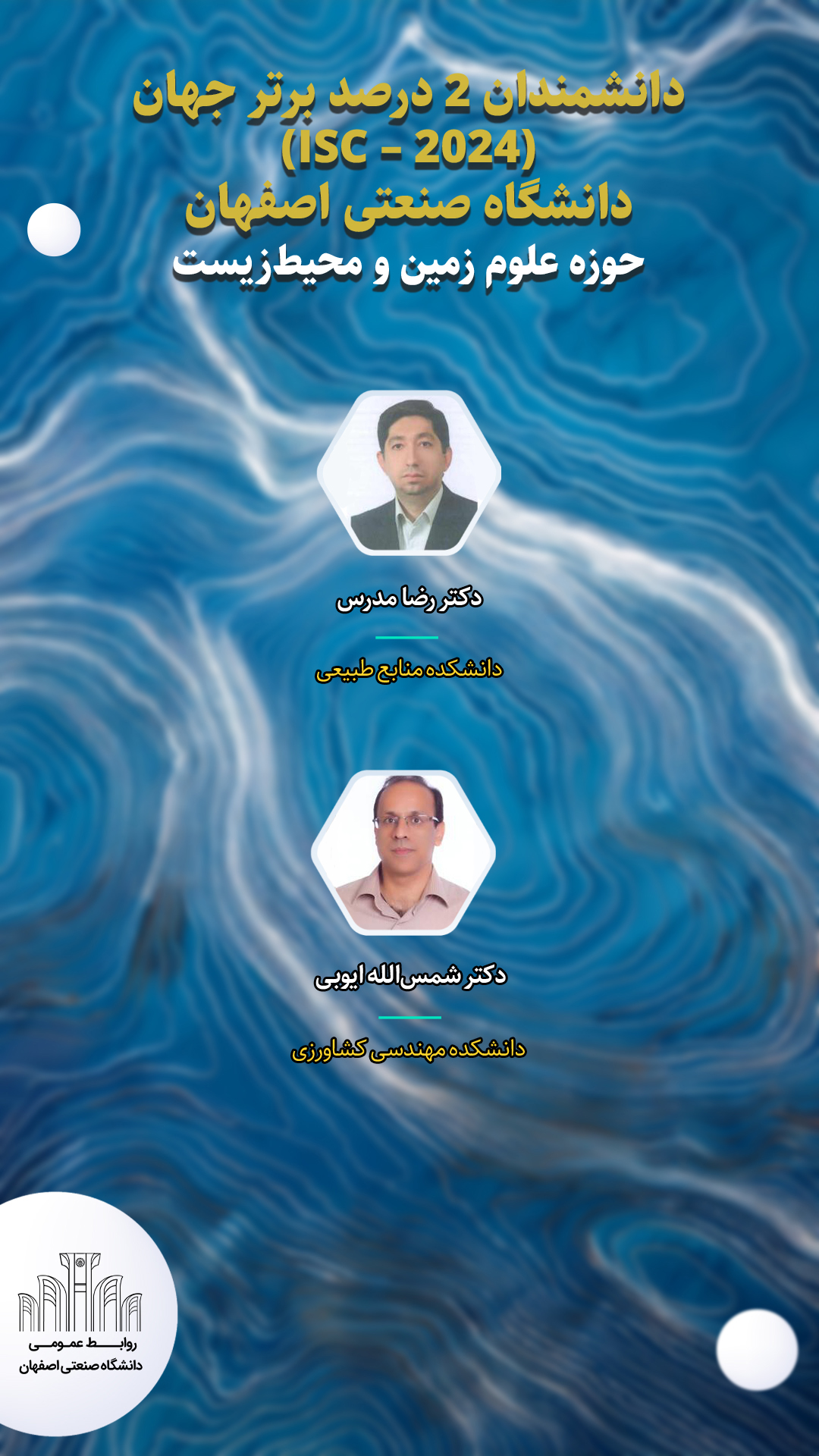 در حوزه علوم زمین و محیط زیست، دکتر رضا مدرس عضو هیأت علمی دانشکده منابع طبیعی و دکتر شمس الله ایوبی عضو هیأت علمی دانشکده مهندسی کشاورزی در حوزه موضوعی فناوری اطلاعات و ارتباطات دکتر مهدی خاشعی، عضو هیأت علمی دانشکده مهندسی صنایع، پژوهشگران 2 درصد برتر دیگر از دانشگاه صنعتی اصفهان به شمار می روند.