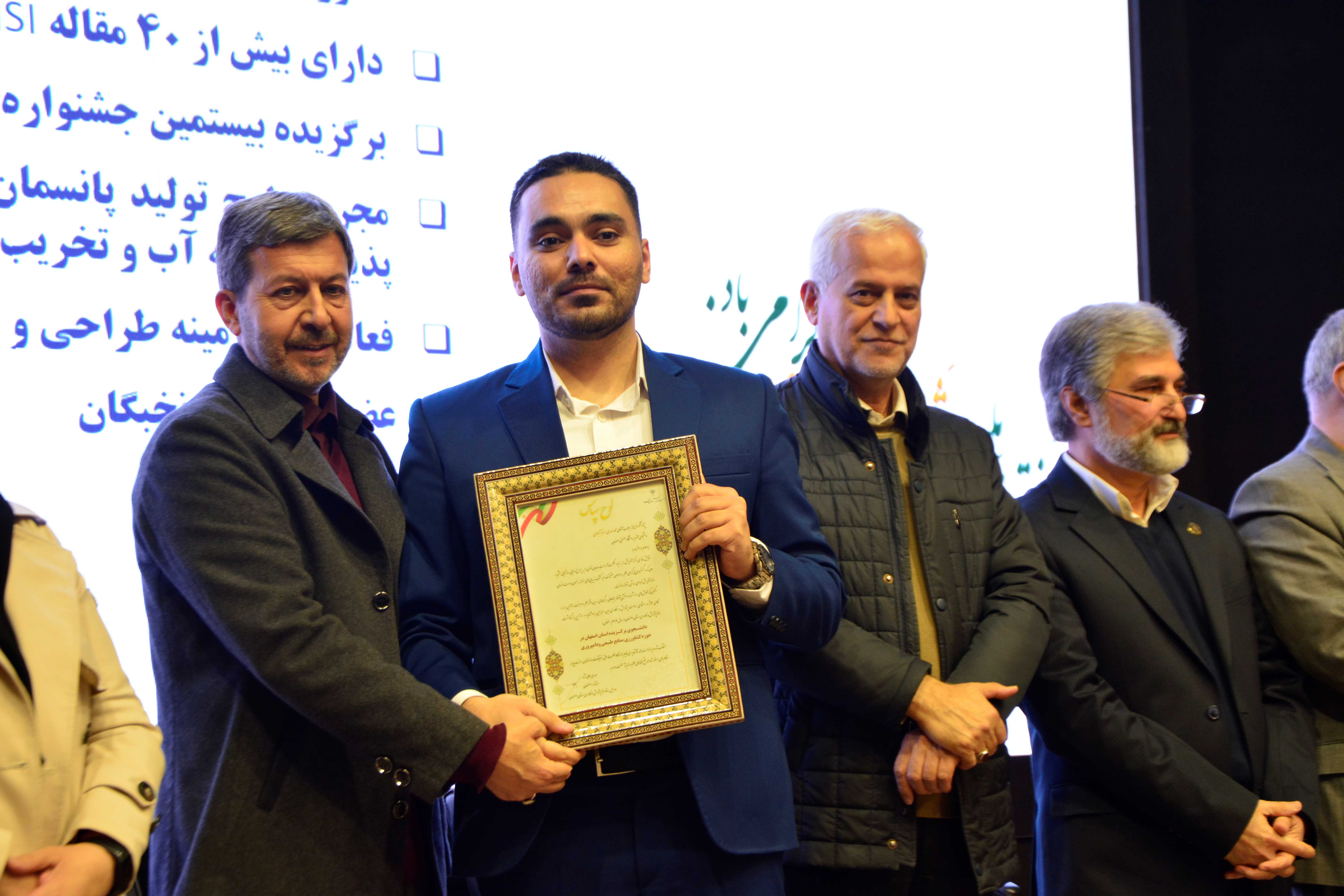 همچنین در بخش دانشجویی، سه دانشجوی پژوهشگر دانشگاه صنعتی اصفهان موفق به کسب عنوان برگزیده شدند. محمدحسین جلالیان و حمیدرضا قربانی در گروه فنی و مهندسی و محمدمهدی رستمآبادی در گروه کشاورزی و منابع طبیعی، برگزیدگان این بخش بودند.